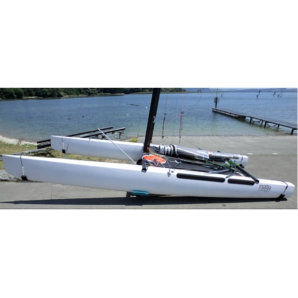 Sehr guter Zustand, ganz Carbon, Mast Marström. 14 m2 Grosssegelfläche. Keine Fock. Idealer Einhandkat. Sehr leichte Handhabung (75 kg). Gutmütiges Verhalten. Sehr leicht aufzurichten, ab 60 kg Steuermanngewicht. Rümpfe im Autoklav behandelt. Halbrunder Traveller. Steckschwerte. Hervorragende Leistungen hart am Wind und Raumschot. Slipwagen. Sehr praktische Blache. Nur im Süsswasser gesegelt. Wasserdicht. Lac de Neuchâtel (CH). |