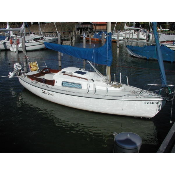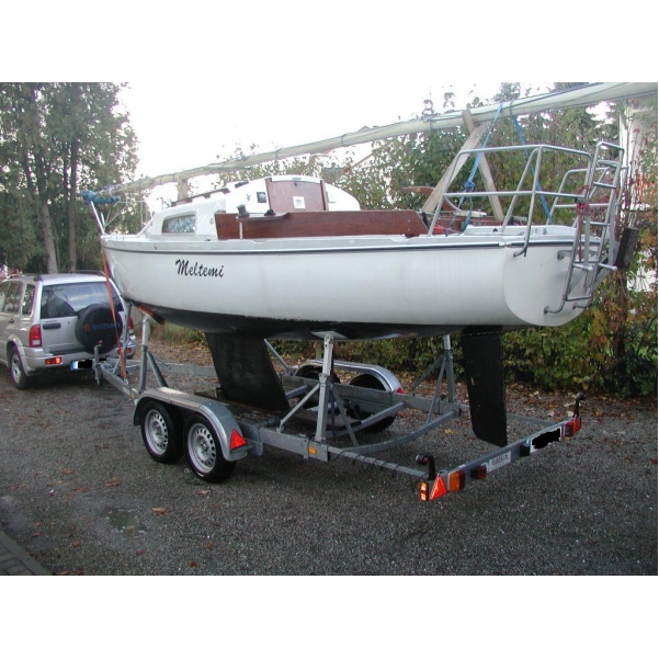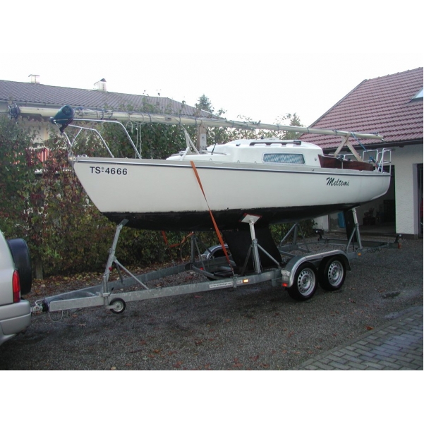 Länge 6,60m, Breite 2,20m, Festkieler Tiefgang 0,95m, Masthöhe 8,00m, Gewicht ca. 1600Kg davon 450Kg Ballast (Bulbkiel) das komplette Gespann wiegt knappe 2 Tonnen, ca. 20m² Segelfläche. Baujahr 78