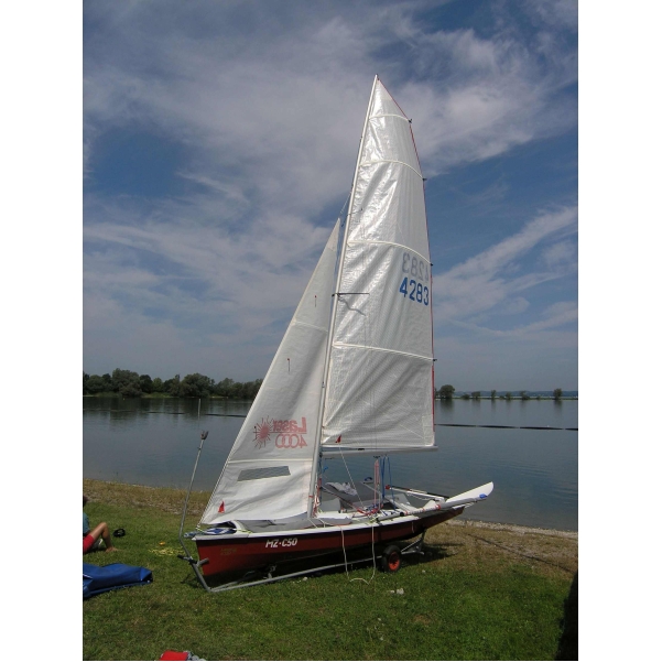 Laser 4000 Jolle mit 250S Harbeck Trailer mit auffahrbarem Slipwagen. Wenig gesegelt (Süßwasser) in sehr gutem Zustand. Unterpersenning und kompletter Segelsatz 2008 neu. Fock 3,9 m2, Großsegel 10,8 m2, Gennaker 17,1 m2. SegelNr. 4282. |