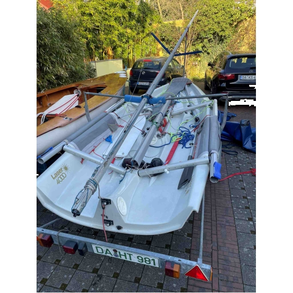 Laser 4000 Jolle mit 250S Harbeck Trailer mit auffahrbarem Slipwagen. Wenig gesegelt (Süßwasser) in sehr gutem Zustand.