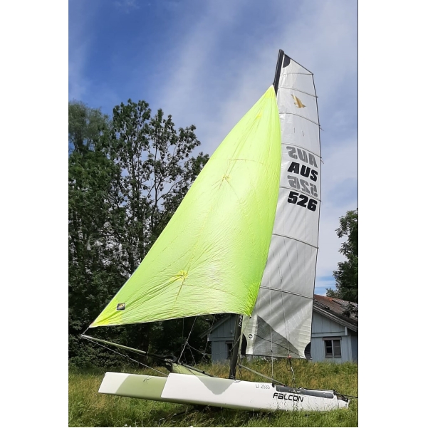 Zum Verkauf steht ein Falcon F16 Katamaran mit Race-Package und Carbon-Mast.